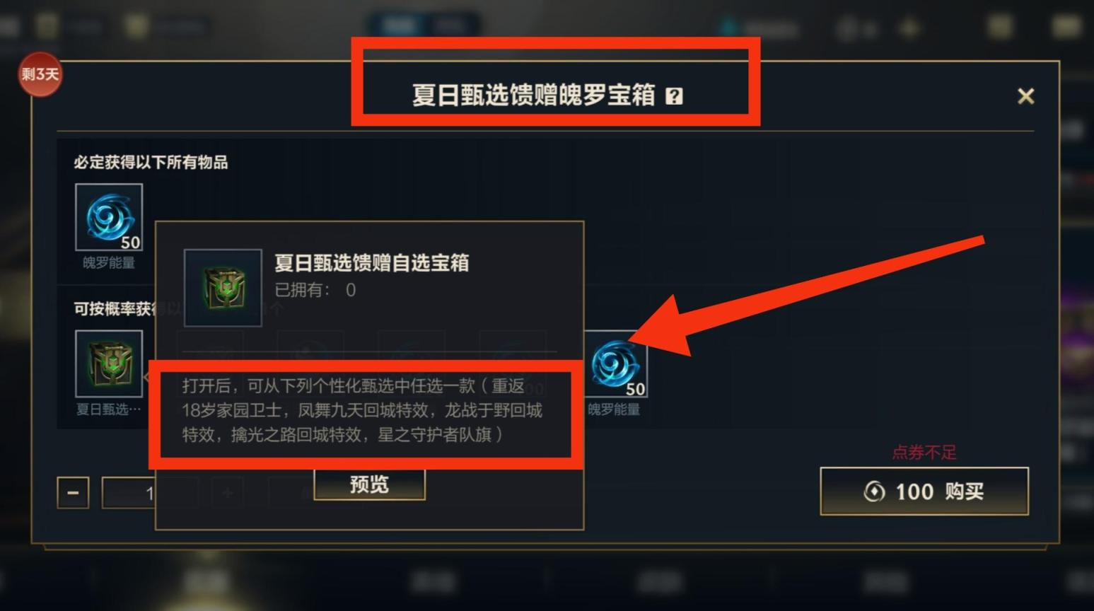 4.购买夏日甄选馈赠魄罗宝箱后,有1%的概率获得夏日甄选馈赠自选宝箱,打开后就可以选择“龙战于野”回城特效。如下图所示: