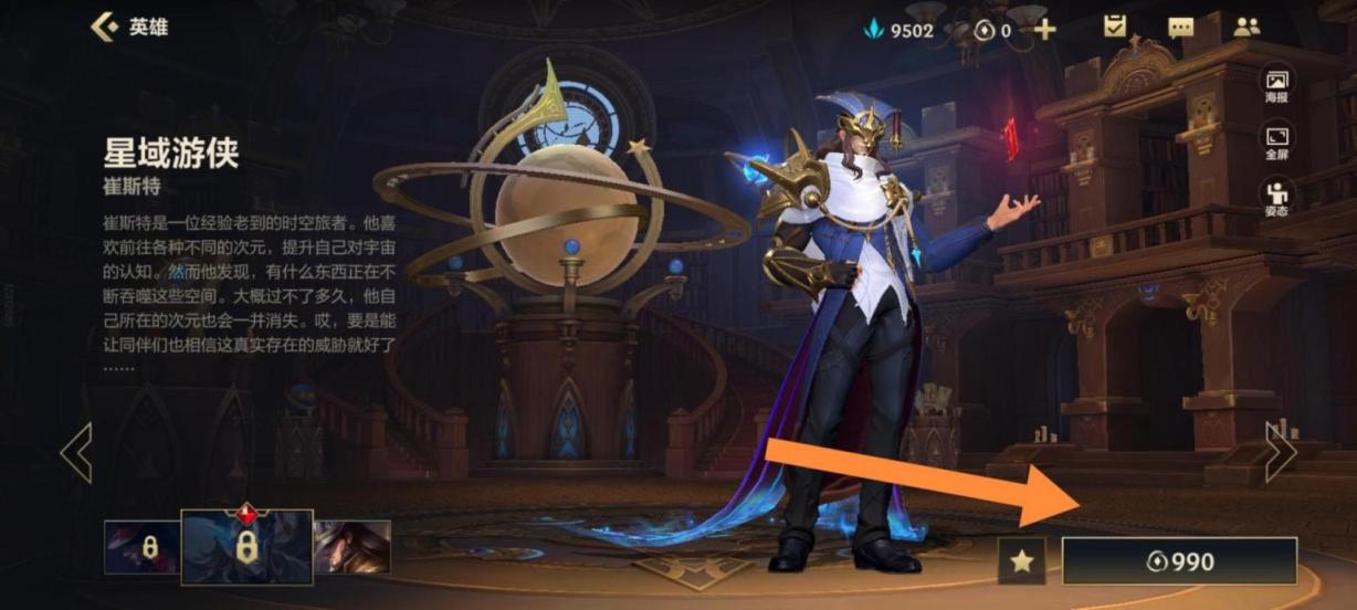 崔斯特的皮肤星域游侠是一款传说皮肤。皮肤建模和特效都很好,商城售价990点券即99元人民币,值得购买。