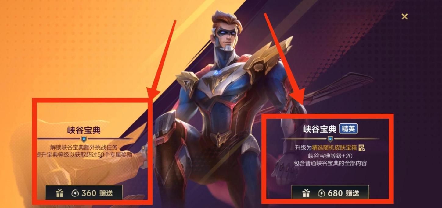 有区别。360点券的普通峡谷宝典,可以解锁峡谷宝典额外挑战任务,提升宝典等级以获取超过50个专属奖励。680点券的是精英版峡谷宝典,可以将皮肤宝箱升级为精选随机皮肤宝箱,峡谷宝典等级 20,包含普通峡谷宝典的全部内容。如下图所示: