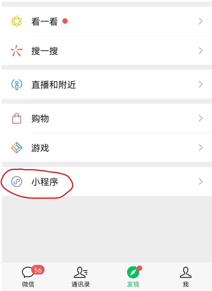 1、打开微信APP的发现界面。点击小程序。