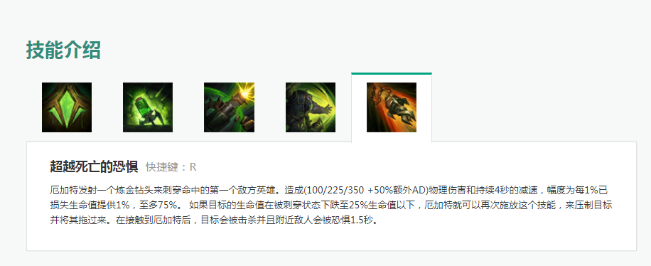 厄加特的大招需要使用两次才能打出斩杀效果,首次施法锁定目标,在目标血量降低到25%之前无法使用第二次斩杀敌人,注意大招的锁定效果长达3秒,正常情况下比较容易打出斩杀线,尤其在团战中完全可以开团之后立刻使用大招攻击对方团队最前面的人,配合队友集火秒杀。