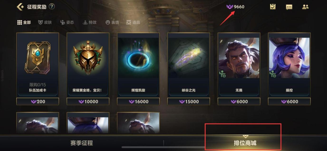 2、进入到赛季征程之后找到右下方的排位商城选项,点击排位商城,就可以在这里面花费排位币兑换想要的物品了,其中有表情、回城特效、队伍加成卡等物品。