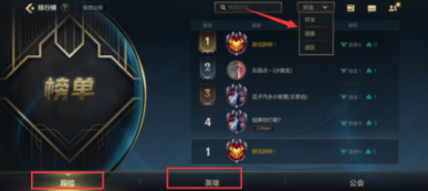 2、在排行榜界面可以选择段位、英雄排行榜,在好友、国服、战区选择进行查看排行榜