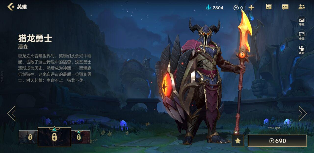 LOL手游购买潘森的猎龙勇士皮肤需要690点券,折合人民币约69元,这款皮肤是史诗皮肤,皮肤特效也还可以,对于喜欢用潘森的玩家还是很值的。