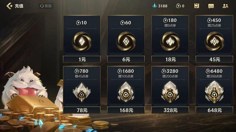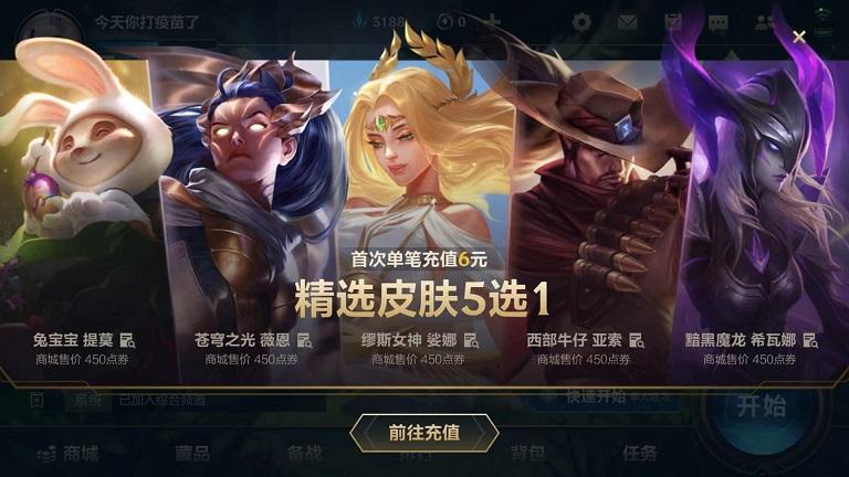 在英雄联盟手游中首充六元的奖励除了我们可以获得60点券之外,还可以在苍穹之光薇恩、缪斯女神娑娜、兔宝宝、提莫黯黑魔龙希瓦娜以及西部牛仔亚索这五种皮肤中任选一个进行领取,这五款皮肤的单独售价都是450点券,可以说这个首充奖励是非常不错的,重要的是三选一。
