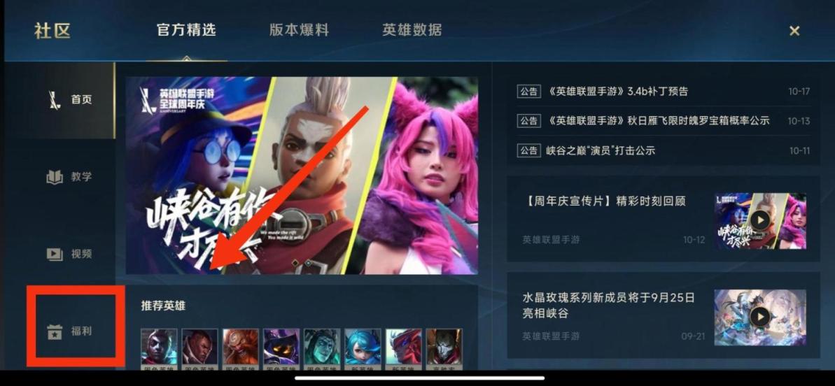 1.进入英雄联盟手游,在游戏首页点击右上角的“社区”。如下图所示: