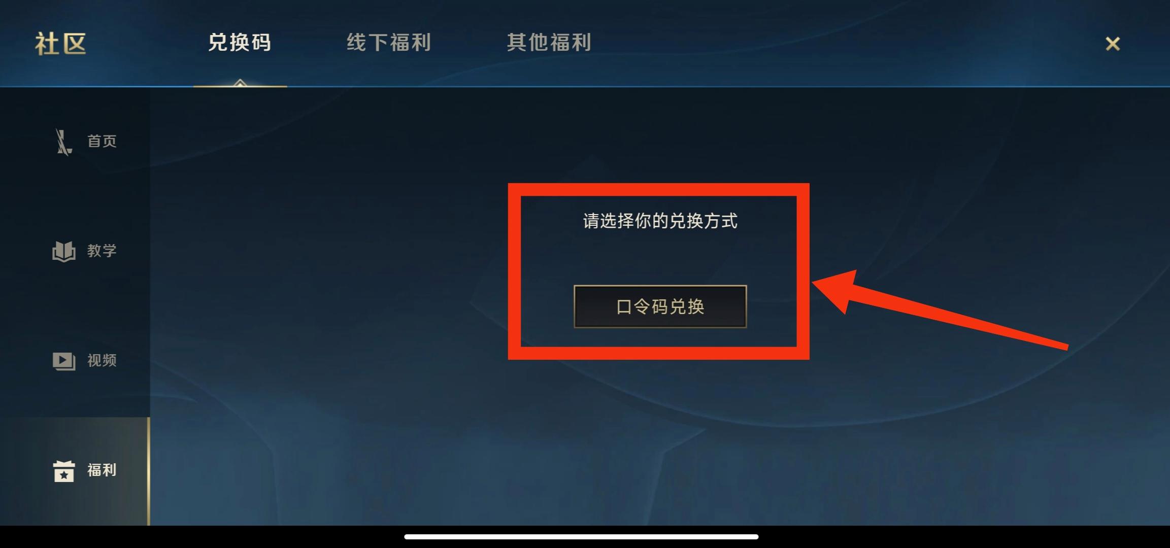 3.在福利界面点击“兑换码”,在点击界面中心的“口令码兑换”方框即可。如下图所示: