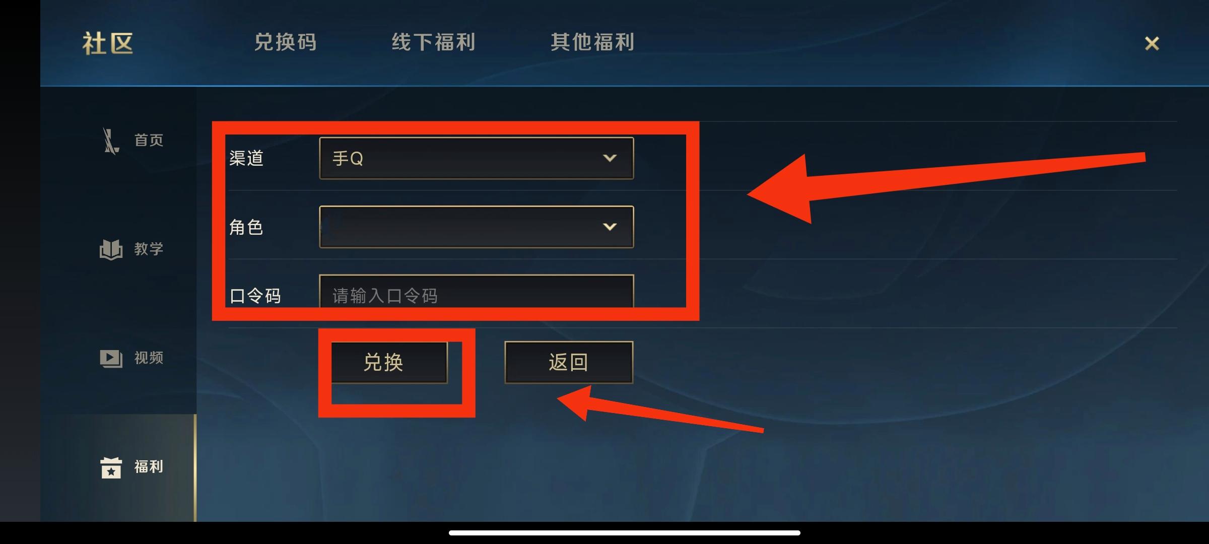 4.在口令码兑换界面,输入对应渠道、角色和口令码,再点击“兑换”即可。如下图所示: