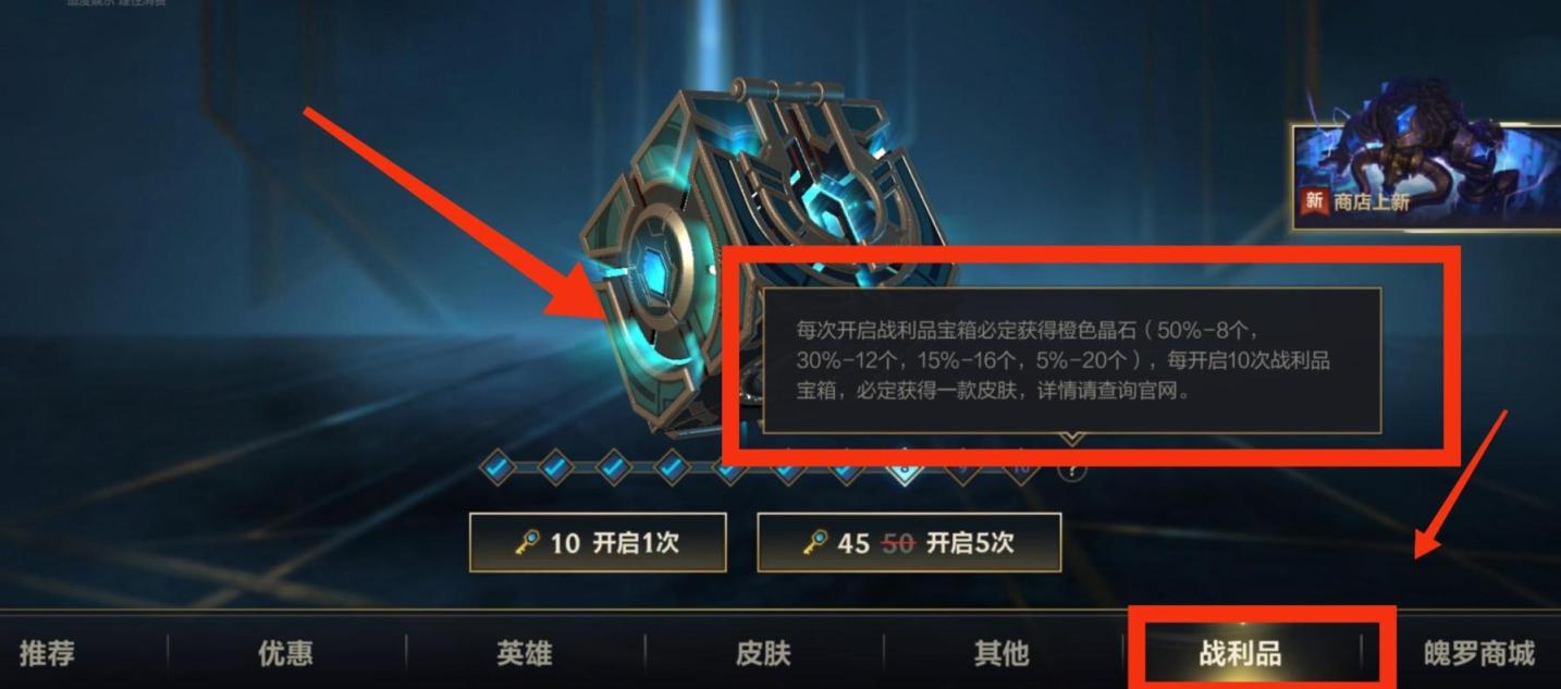 2.进入商城后,点击“战利品”,即可在战利品界面中心看见战利品宝箱。玩家可花费水晶秘钥开启战利品宝箱,每次开启必获得橙色原石,每开启10次战利品宝箱,必定获得一款皮肤。如下图所示: