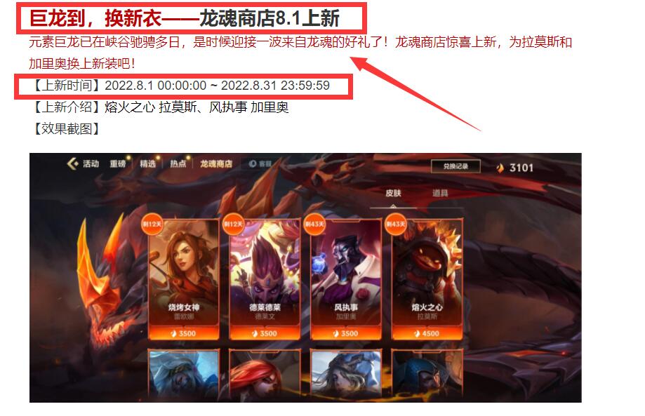 1.上新时间:2022.8.1 00:00:00-2022.8.31 23:59:59,上新皮肤是熔火之心 拉莫斯和风执事 加里奥。如下图所示: