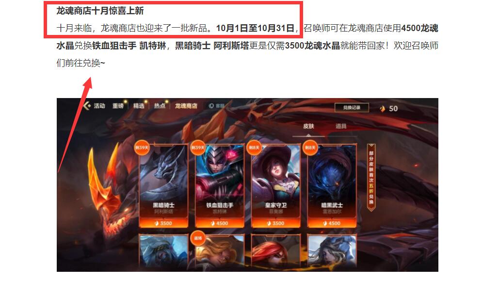 3.上新时间:2022.10.1-2022.10.31,上新皮肤是铁血狙击手 凯特琳和黑暗骑士 阿利斯塔。如下图所示: