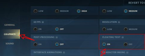 4.进入【图像设置】页面后,找到【floating text】这个选项。我们点击ON就表示已经开启了伤害显示,off则是伤害显示关闭。