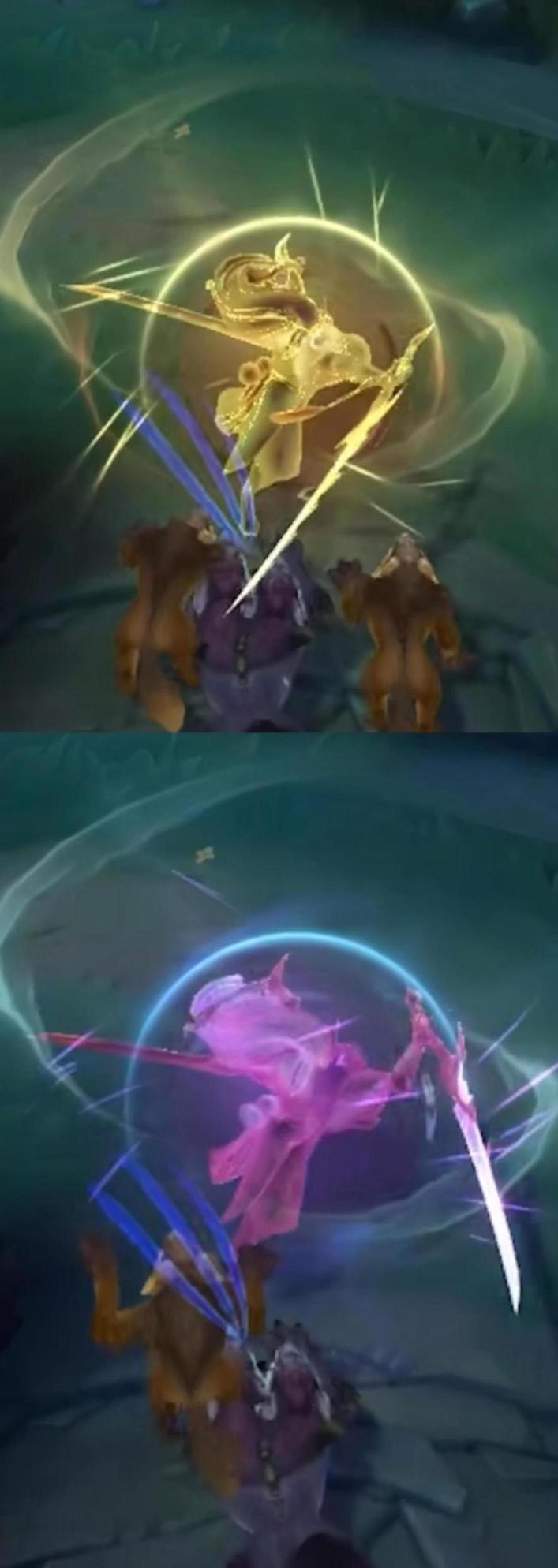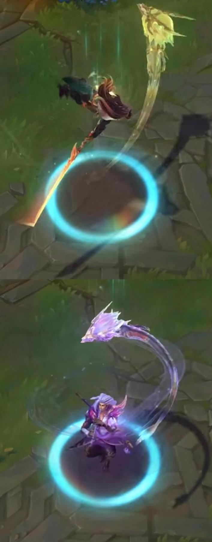 3.打野怪特效对比。上为昼日真龙,下为夜月幻龙。昼日真龙中亚索显得更加清晰,特效颜色也比夜月幻龙的紫色更鲜艳突出。如下图所示: