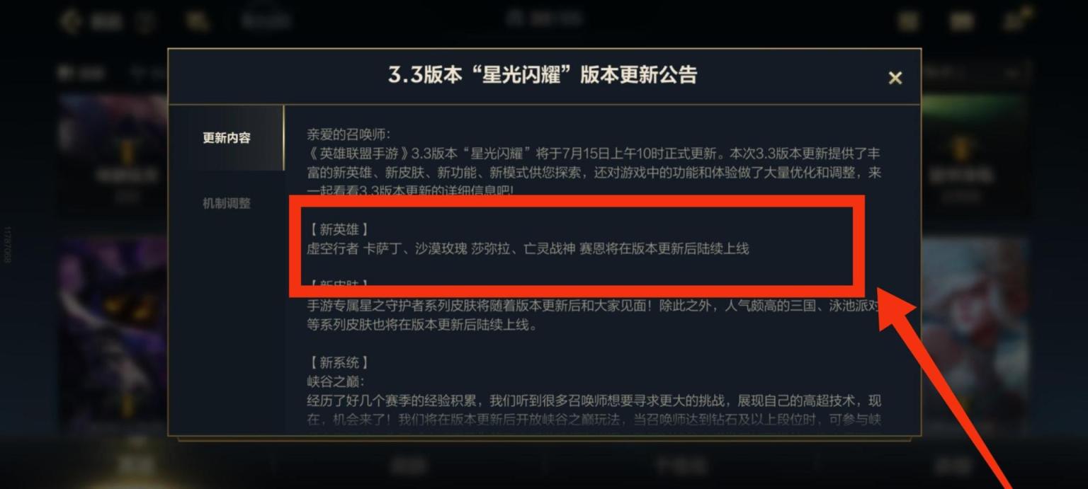 1.英雄联盟手游官方在7月15日发布的3.3版本更新公告中表示:“虚空行者 卡萨丁、沙漠玫瑰 莎弥拉、亡灵战神 赛恩将在版本更新后陆续上线”。如下图所示: