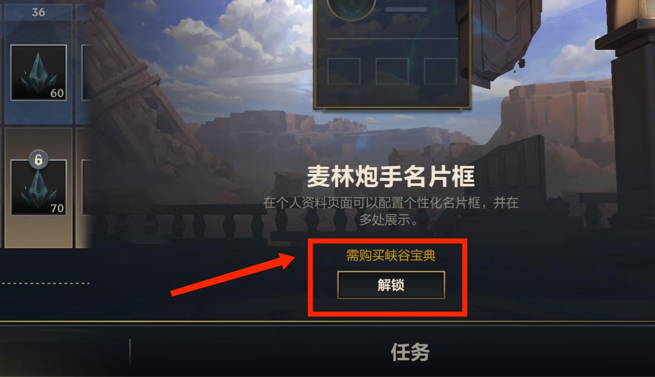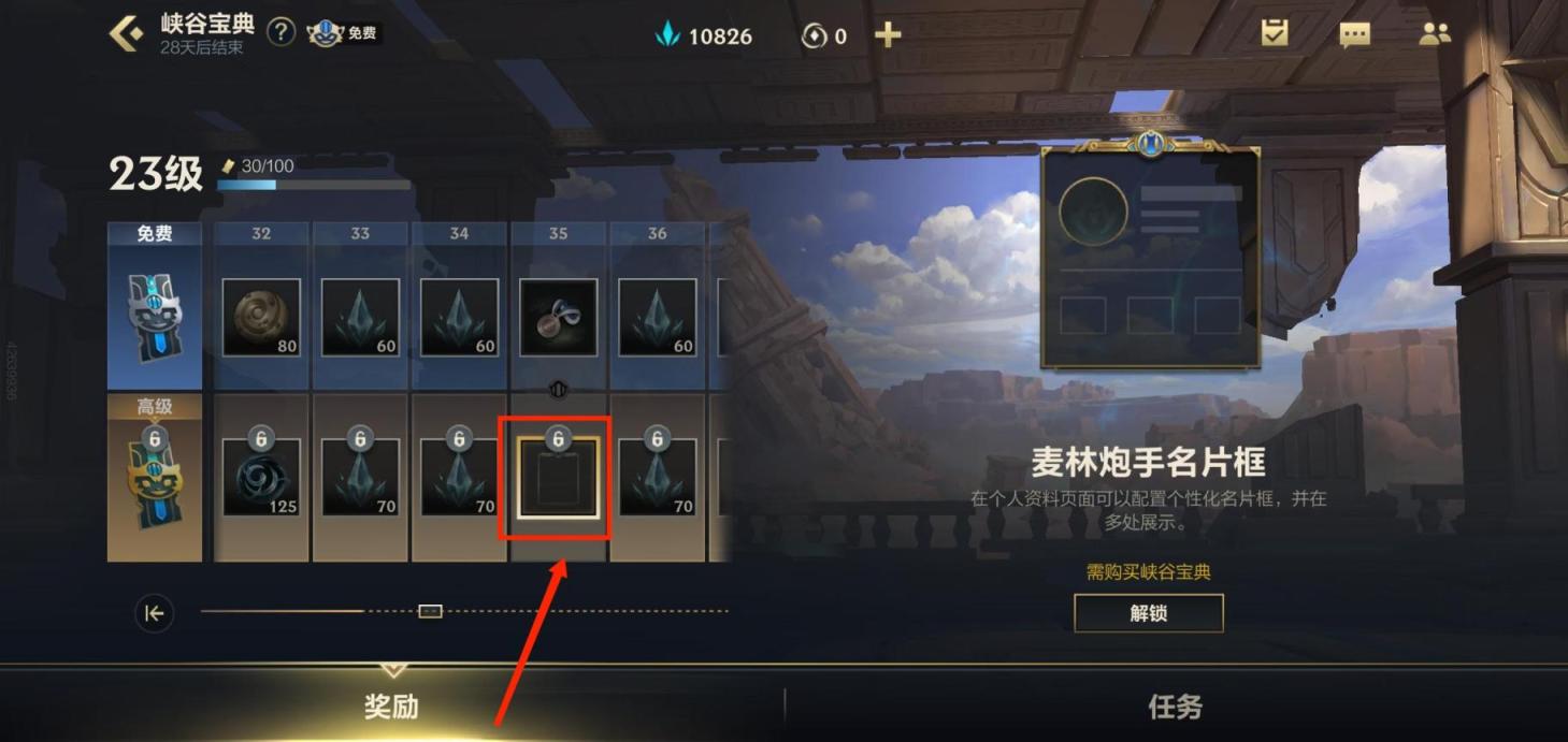 3、解锁完后,在高级奖励栏往右边划到等级35,即可看到麦林炮手名片框,需要峡谷宝典达到35级才可解锁获得。