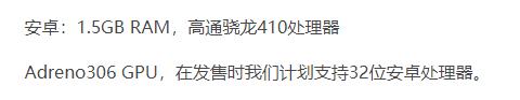 1. 安卓手机:安卓:1GB RAM,高通骁龙410处理器,Adreno306 GPU,在发售时计划支持32位安卓处理器。