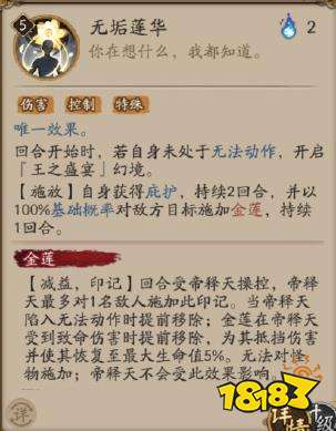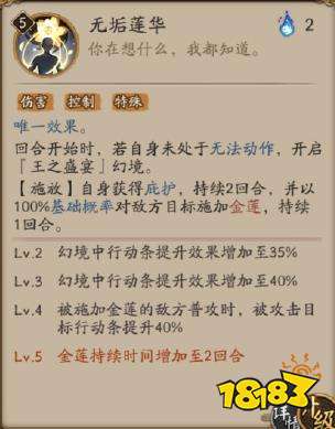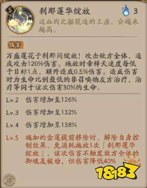 Lv.5施加的金莲提前移除时,解除自身控制效果,免消耗施放1次「刹那莲华绽放」,该次伤害不触发敌方全体的御魂及被动,但伤害降低40%
