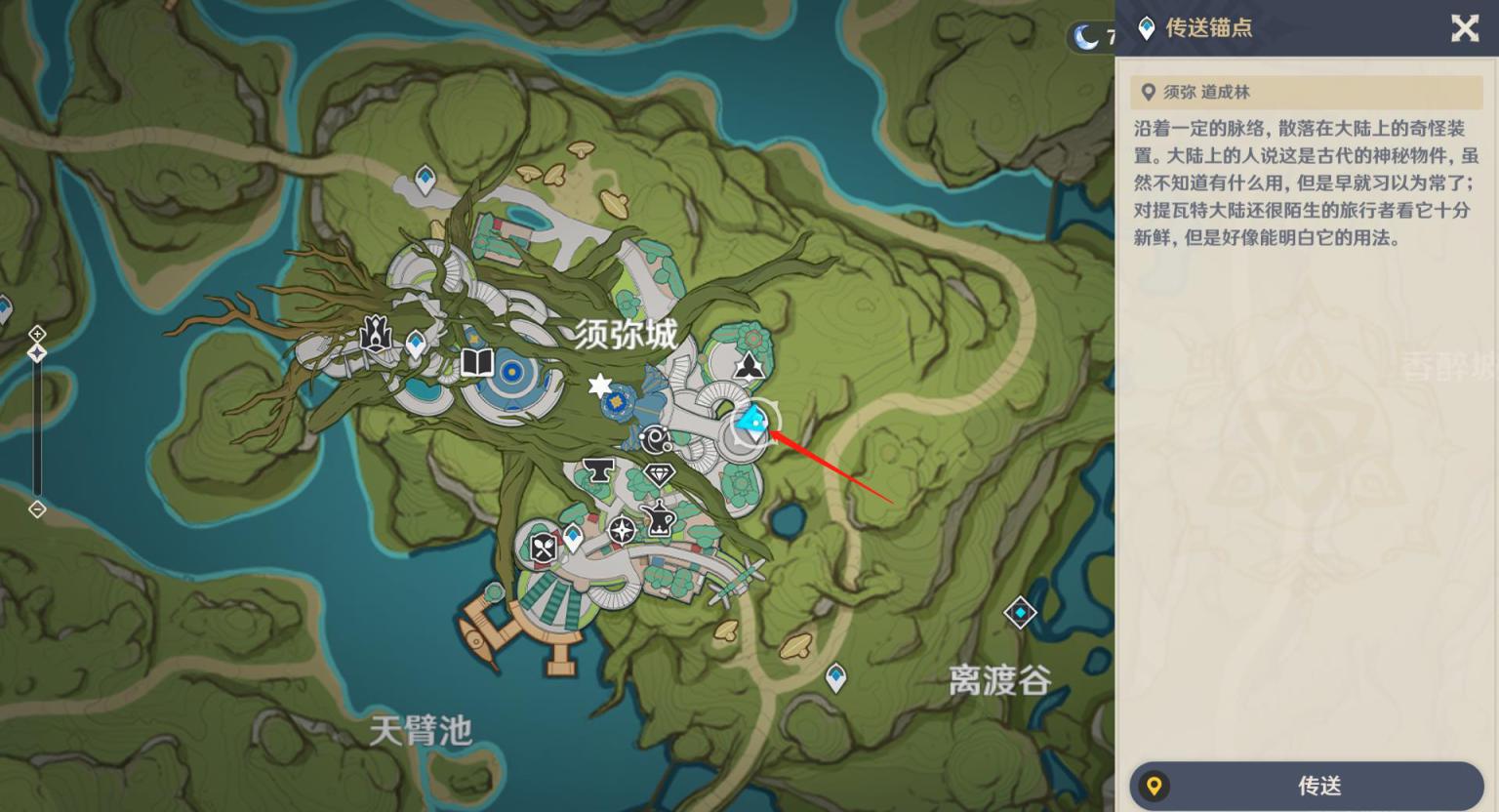 1、以草神瞳共鸣石为例子,先来到须弥城东南方的锚点。