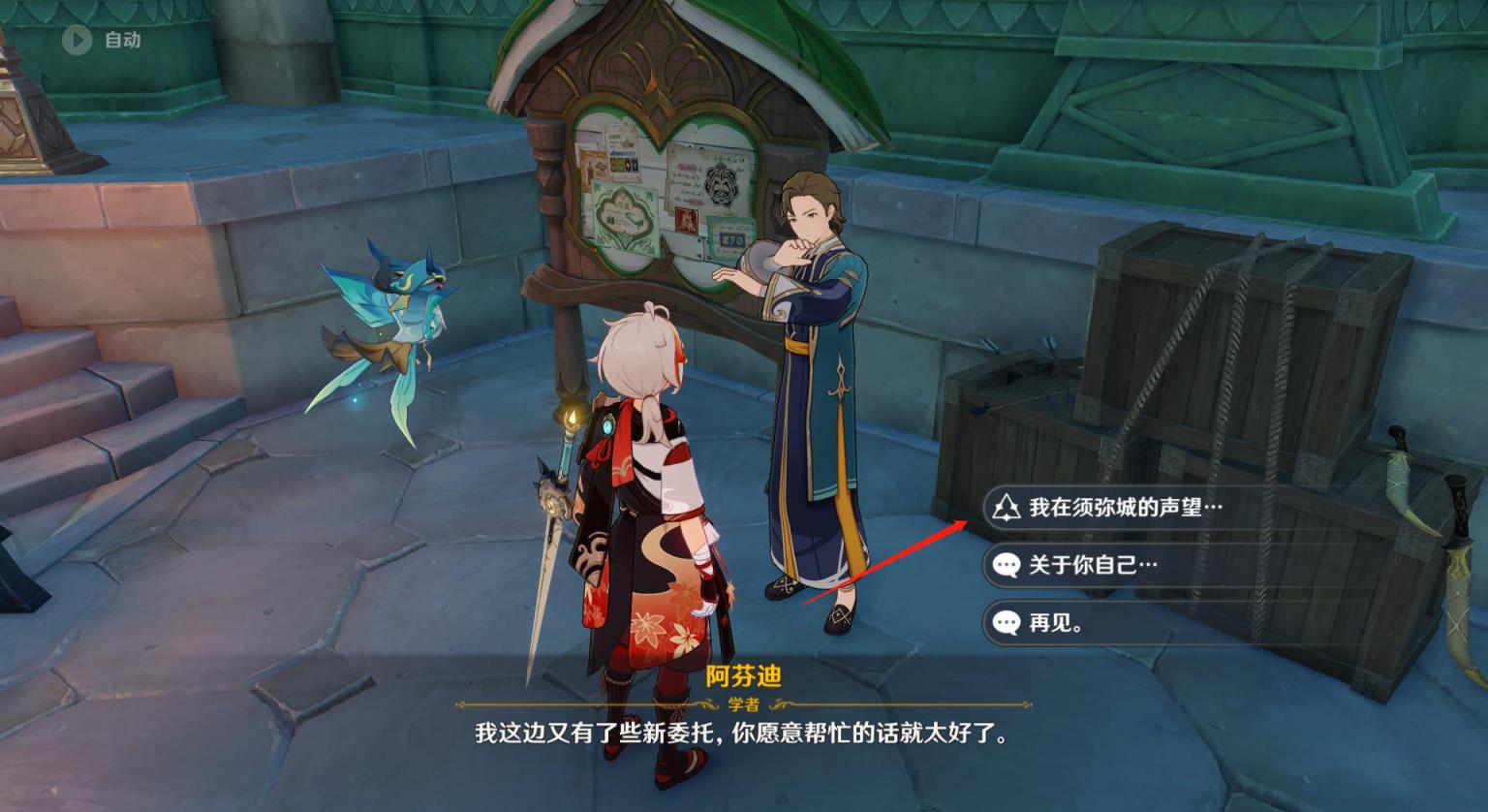 3、降落后与须弥声望专员阿芬迪对话,选择我在须弥城的声望选项,进入须弥的声望系统。