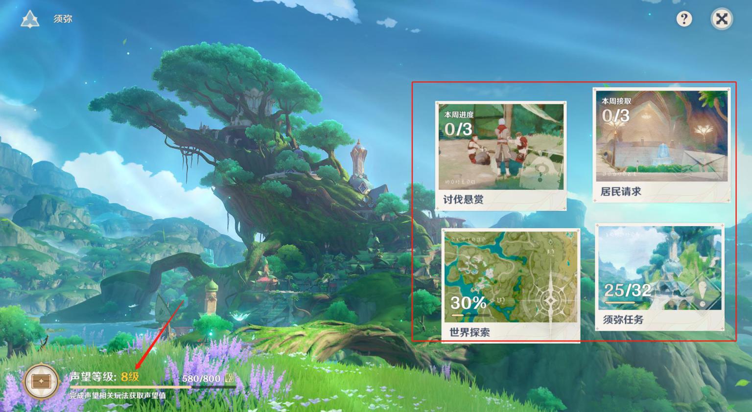 4、通过完成声望系统内的讨伐悬赏、居民请求、世界任务以及世界探索这四种方式来获得声望经验值,将须弥地区的声望提升到八级或以上。