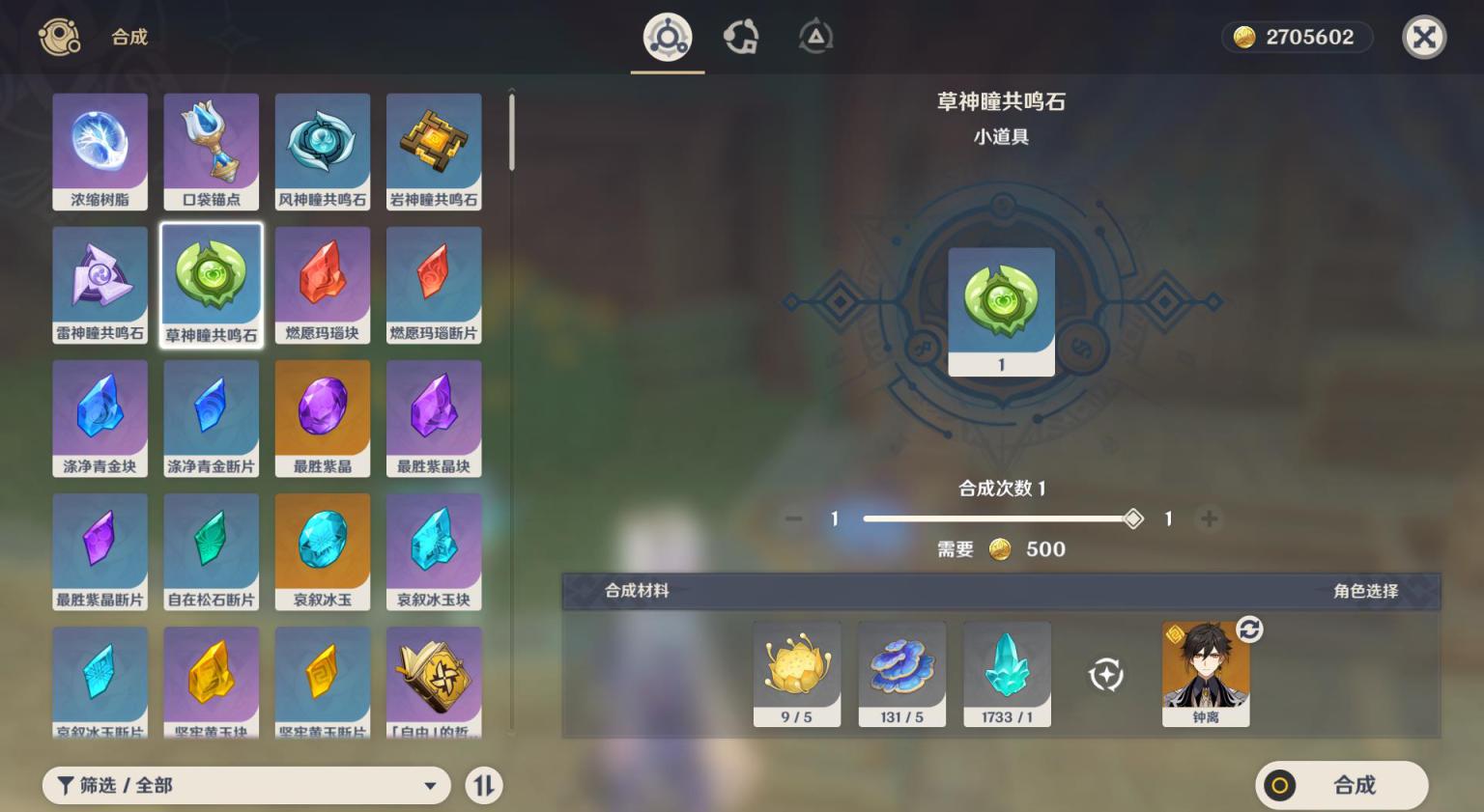 6、接着来到各大城区的炼金台,学习刚刚获得的图纸后就可以掌握草神瞳共鸣石的制作配方,准备好五个月莲、五个树王圣体菇以及一个水晶块就可以做出一颗草神瞳共鸣石。