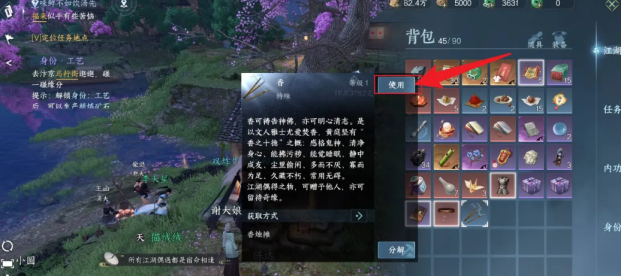 4、移动到土地庙后,打开角色背包,使用刚刚买的香。