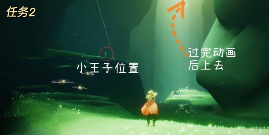 2、领取任务之后会让你到达雨林的隐藏图之中,进入隐藏图之后,在左上角的台子上可以看到小王子,牵上小王子过完动画飞上去。